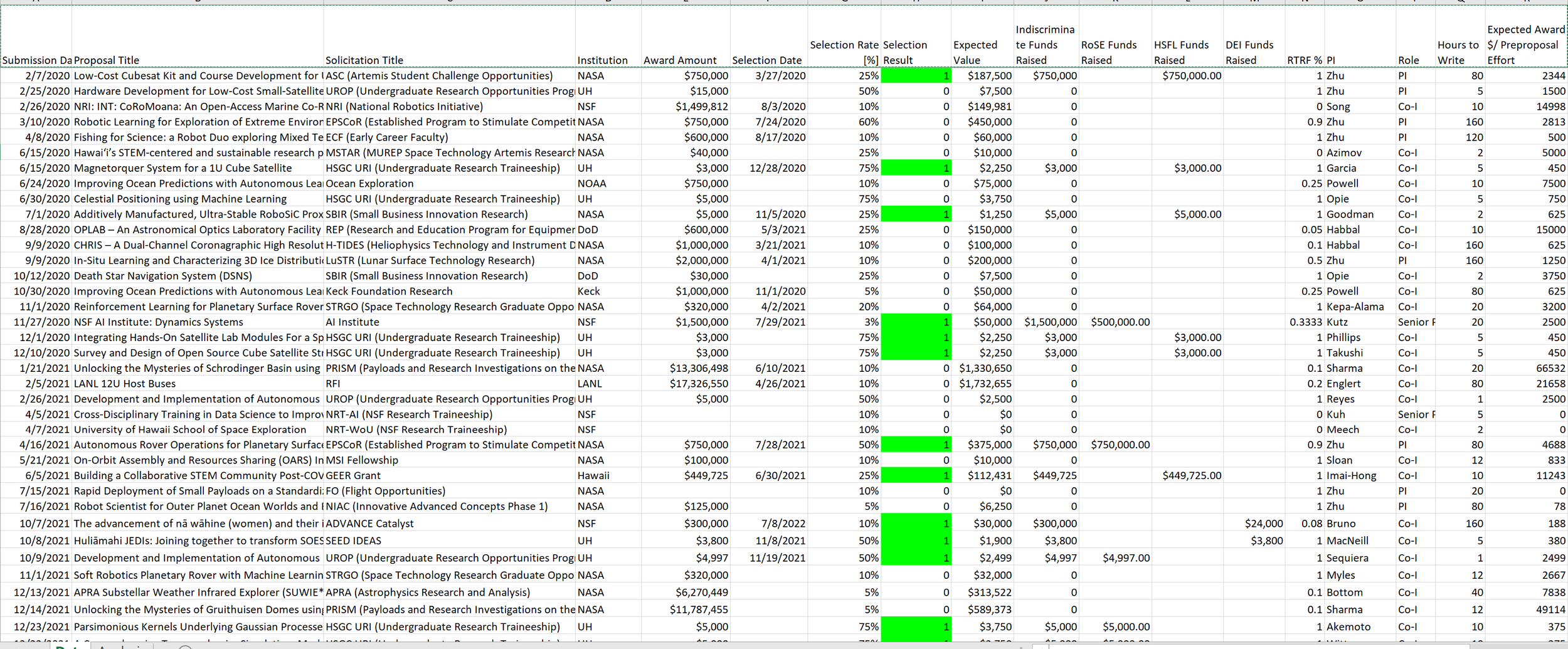 Indiscriminate Funds Raised - the amount of the award if the selection result indicates success. This column is to keep track of the total amount of money I’ve won. The following subcategories are so I can keep track of how much money I’ve won for different research topics I care about: