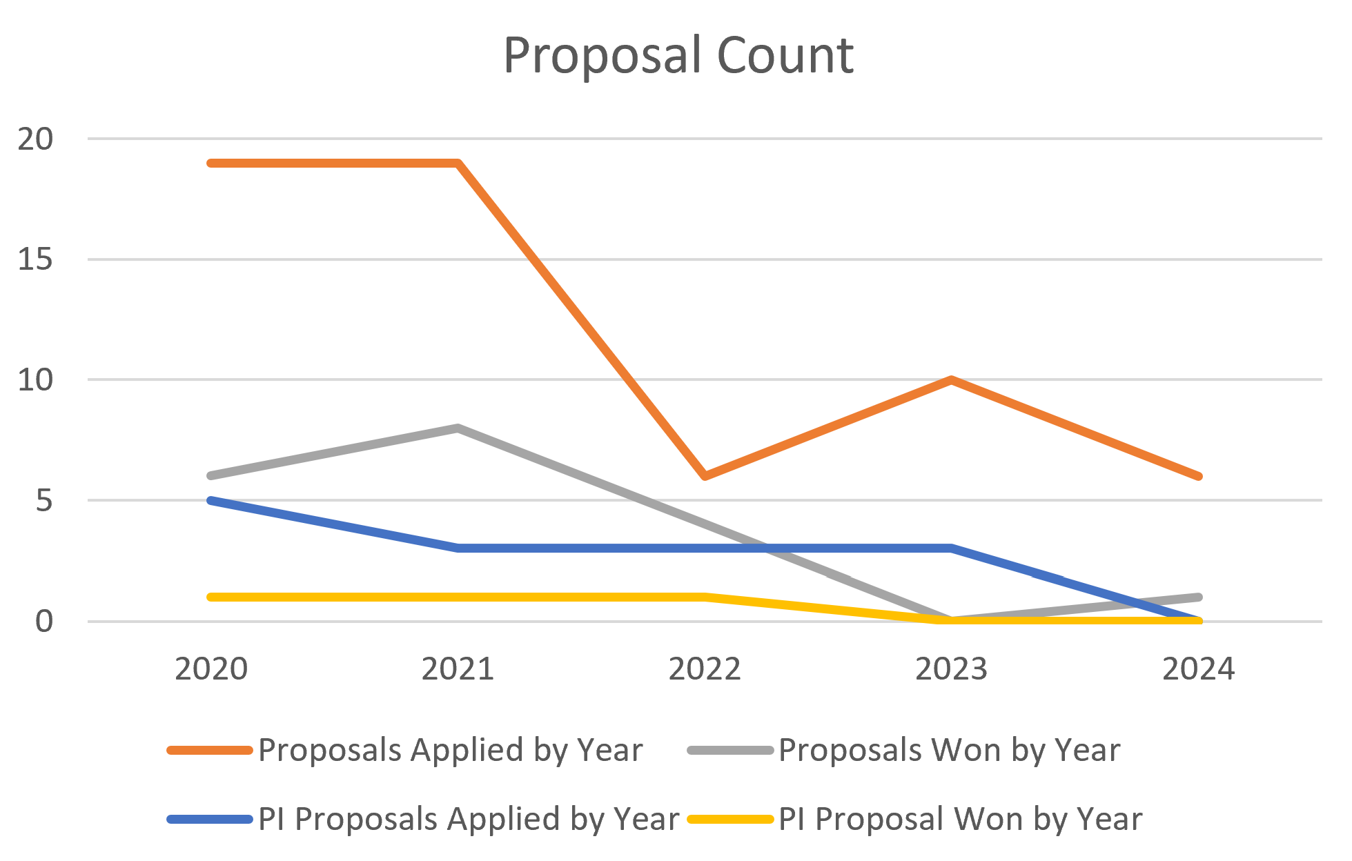 I've applied to the most proposals in my first two years with a steady decline over time. Same trend holds with PI proposals. That makes sense to me since I was very thirsty for funding my first two years. As I received funding, I applied to fewer proposals and I spent more time managing funded projects.